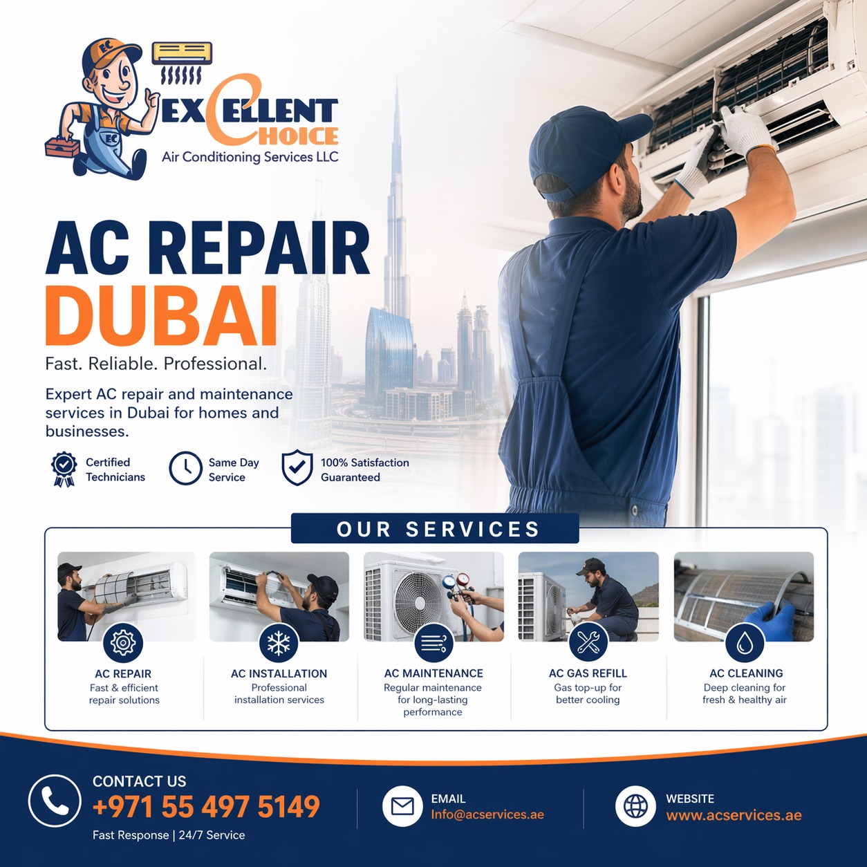 If your AC is not cooling well or showing signs of trouble, do not wait until it completely stops working. Instead, contact Excellent Choice Air Conditioning Services LLC today for reliable and fast AC Repair Dubai services.